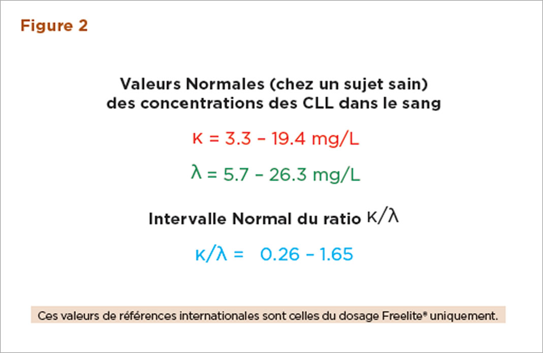 Dans le cas où le pic à l’EPS correspond à une quantité inférieure à 10 g/L, la maladie est dite « non-mesurable à l’électrophorèse ». Les CLL sériques peuvent alors être choisies comme marqueur de suivi. Les CLL sont dosées sur un prélèvement de sang à l’aide d’un appareil appelé turbidimètre ou néphélomètre. Leur quantité (ou concentration) est un chiffre exprimé en milligramme par litre de sang (mg/L) rendu automatiquement par l’appareil (voir valeurs normales - figure 2).